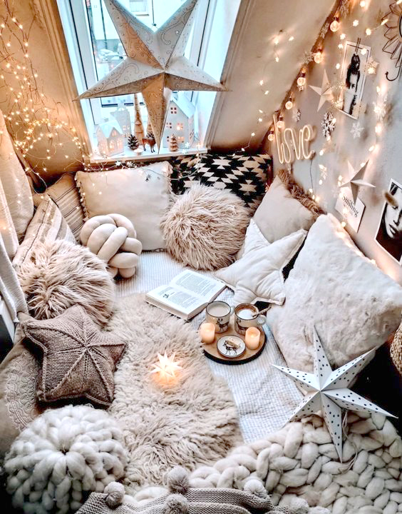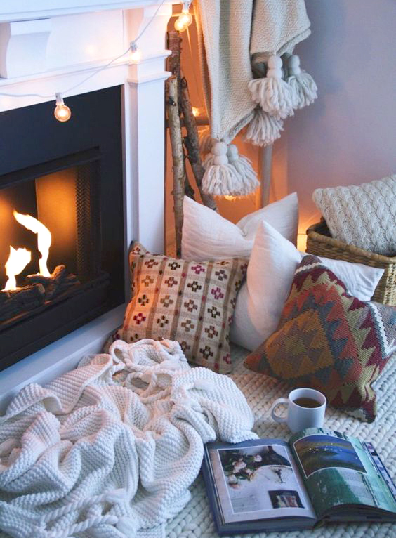 Στο σπίτι σας σίγουρα υπάρχει μια γωνιά που μπορεί να διαμορφωθεί αναλόγως. Ζεστός φωτισμός, κάθε λογής μαξιλάρια, πλεκτές κουβέρτες και κεριά θα φτιάξουν αυτή την ατμόσφαιρα που δε θα θέλετε να “ξεκολλήσετε”.