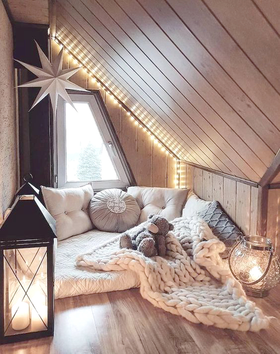 Μια επιτυχημένη γωνιά χουχουλιάσματος είναι αυτή που μοιάζει απομονωμένη, ιδανικά σε σοφίτα, με έντονο το στοιχείο του ξύλου, ένα στρώμα αναπαυτικό και αρκετά βιβλία που θα σας κάνουν να χαλαρώσετε και να “ταξιδέψετε” μιας και με την κυριολεκτική έννοια μπορεί να καθυστερήσετε.