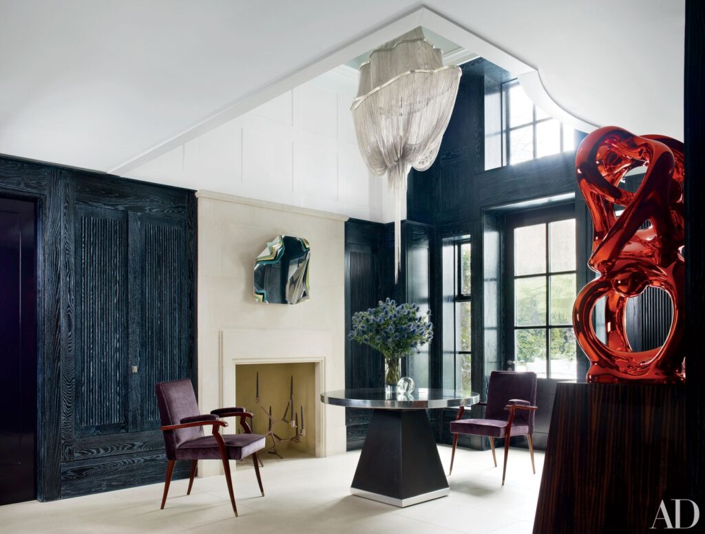 Στον χώρο εισόδου ενός σπιτιού του Λονδίνου που σχεδιάστηκε από τον Rafael de Cárdenas, κρέμεται ένα εντυπωσιακό φωτιστικό από τον Hudson Furniture. Στο ίδιο δωμάτιο περίοπτη θέση έχει ένα εκτυφλωτικό κόκκινο γλυπτό δια χειρός Anselm Reyle.