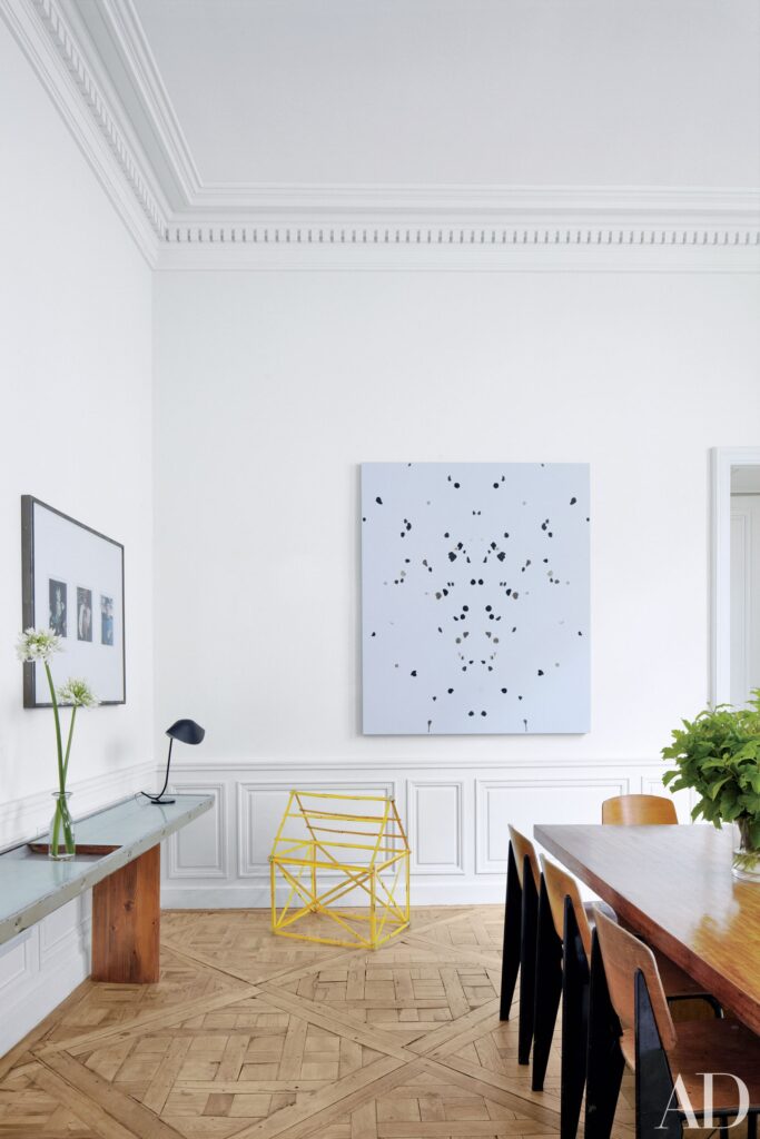 Ένα έργο από τσίχλες σε καμβά του Adam McEwen κρέμεται πάνω από ένα κίτρινο γλυπτό του Hans-Peter Feldmann στην τραπεζαρία των εμπόρων τέχνης Patrick και Laurence Seguin στο Παρίσι.