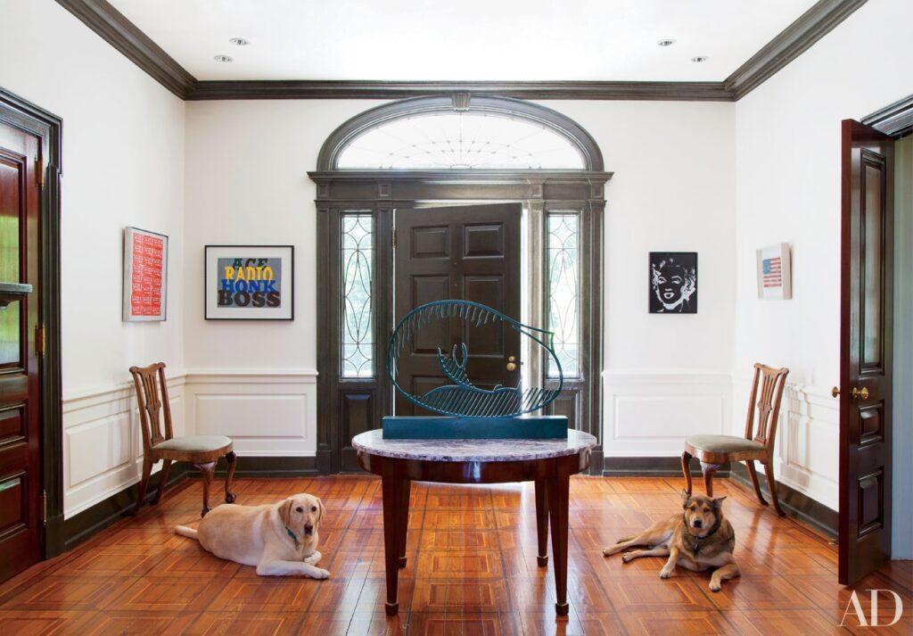 Τα σκυλιά διάσωσης Molly και Puppy χαλαρώνουν στην είσοδο ενός σπιτιού της Φιλαδέλφειας που σχεδιάστηκε από τον Thomas Jayne. Την αίθουσα κοσμούν έργα των Andy Warhol, Ed Ruscha και Jasper Johns και ένα γλυπτό του Roy Lichtenstein που βρίσκεται πάνω στην κεντρική ροτόντα του δωματίου.