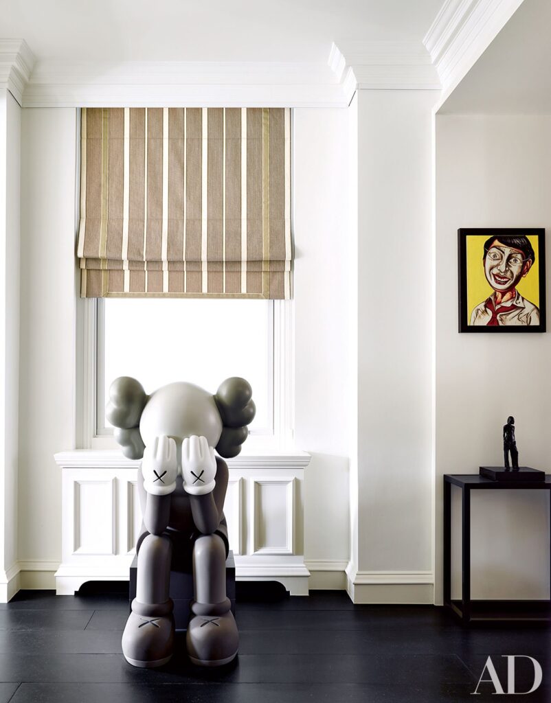 Ένα γλυπτό του KAWS (αριστερά) και ένας πίνακας του Zeng Fanzhi κυριαρχούν στην είσοδο του δεύτερου ορόφου ενός αρχοντικού στο Λονδίνο, διακοσμημένο από τον François Catroux.