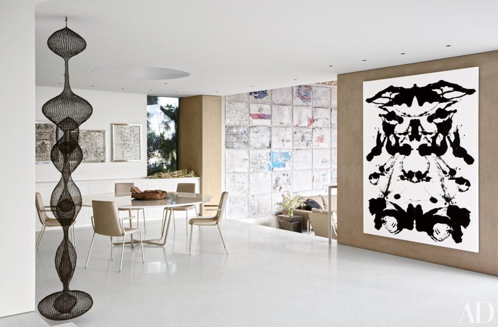 Στην άκρη της τραπεζαρίας στο σπίτι του καλλιτέχνη Chara Schreyer στο Λος Άντζελες, που ανακαινίστηκε από την αρχιτεκτονική εταιρεία McRitchie Design, έχει τοποθετηθεί ένα κρεμαστό γλυπτό της Ruth Asawa ενώ απέναντι εμφανίζεται ένας πίνακας ζωγραφικής του Andy Warhol Rorschach.