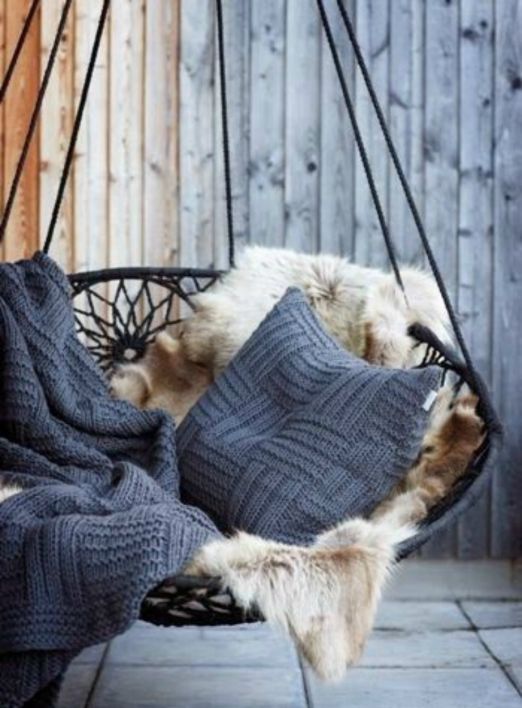 Για να δημιουργήσετε ένα πιο cozy σκηνικό δεν έχετε παρά να επενδύσετε τα έπιπλα της βεράντας σας με ζεστά υφάσματα όπως κουβέρτες με χοντρή μάλλινη πλέξη, συνθετικές γούνες ακόμα και φλοκάτες. Τοποθετήστε τα ανάρριχτα στον καναπέ, την πολυθρόνα ακόμα και στα σκαμπό για να έχετε το επιθυμητό αποτέλεσμα. Η άνεση και η ζεστασιά που θα σας προσφέρουν θα σας κάνει να μην ξεκολλάτε…