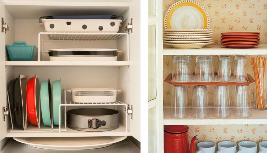 Μπορεί να σας ακούγεται περίεργο αλλά είναι μια κάποια λύση! Αν στα ντουλάπια σας έχετε μεγάλους χώρους με τα ράφια έχουν ικανοποιητικές αποστάσεις μεταξύ τους τότε προσθέστε εύκολα ένα επιπλέον ράφι. Το κενό μεταξύ των ραφιών, ο ανεκμετάλλευτος χώρος που δημιουργείτε πάνω από τα ποτήρια, για παράδειγμα, μπορεί να είναι σωτήριος! Τα επιπλέον ράφια μπορεί να είναι μεταλλικά ή ξύλινα ενώ εύκολα μπορείτε να βρείτε στο εμπόριο.