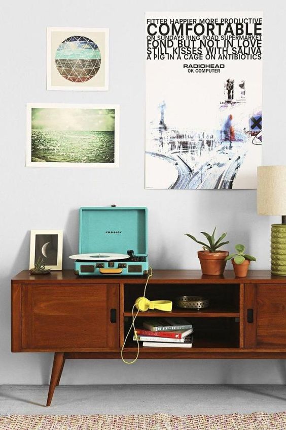 Τα έπιπλο κονσόλα με το χαρακτηριστικό σκούρο ξύλο και τα πλαγιαστά πόδια δίνει την retro πινελιά. Αν σ’ αυτό τοποθετήσετε φωτιστικά, παλιά ραδιόφωνα, πικ απ, posters σε κάδρα αναλόγου ύφους και μικροαντικείμενα έχετε δημιουργήσει τη γωνιά που επιθυμούσατε!