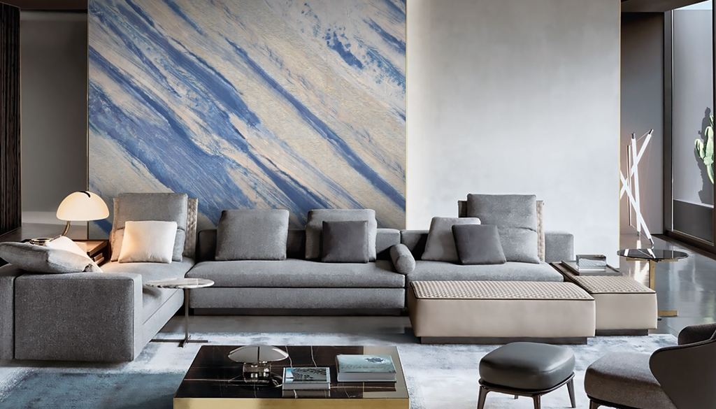 Το όνομα αυτού, Azul Macaubas. Πρόκειται για ένα γαλάζιο χαλαζίτη,  μια πολύ εξωτική, σπάνια και ειδική πέτρα που προέρχεται από τη Βραζιλία. Το χρώμα του μοναδικό, με αποχρώσεις του μπλε-γαλάζιου και ραβδώσεις διαφόρων εντάσεων, όπως πιτσιλιές χρυσού και μπεζ, του προσδίδουν μια φυσική εμφάνιση, τόσο στο σατινέ όσο και στο γυαλισμένο. Το εξαιρετικά σπάνιο αυτό μάρμαρο δημιουργεί  γοητευτικά παιχνίδια με την πτώση του φωτός δίνοντας του ιδιαίτερες και ασυνήθιστες αποχρώσεις.