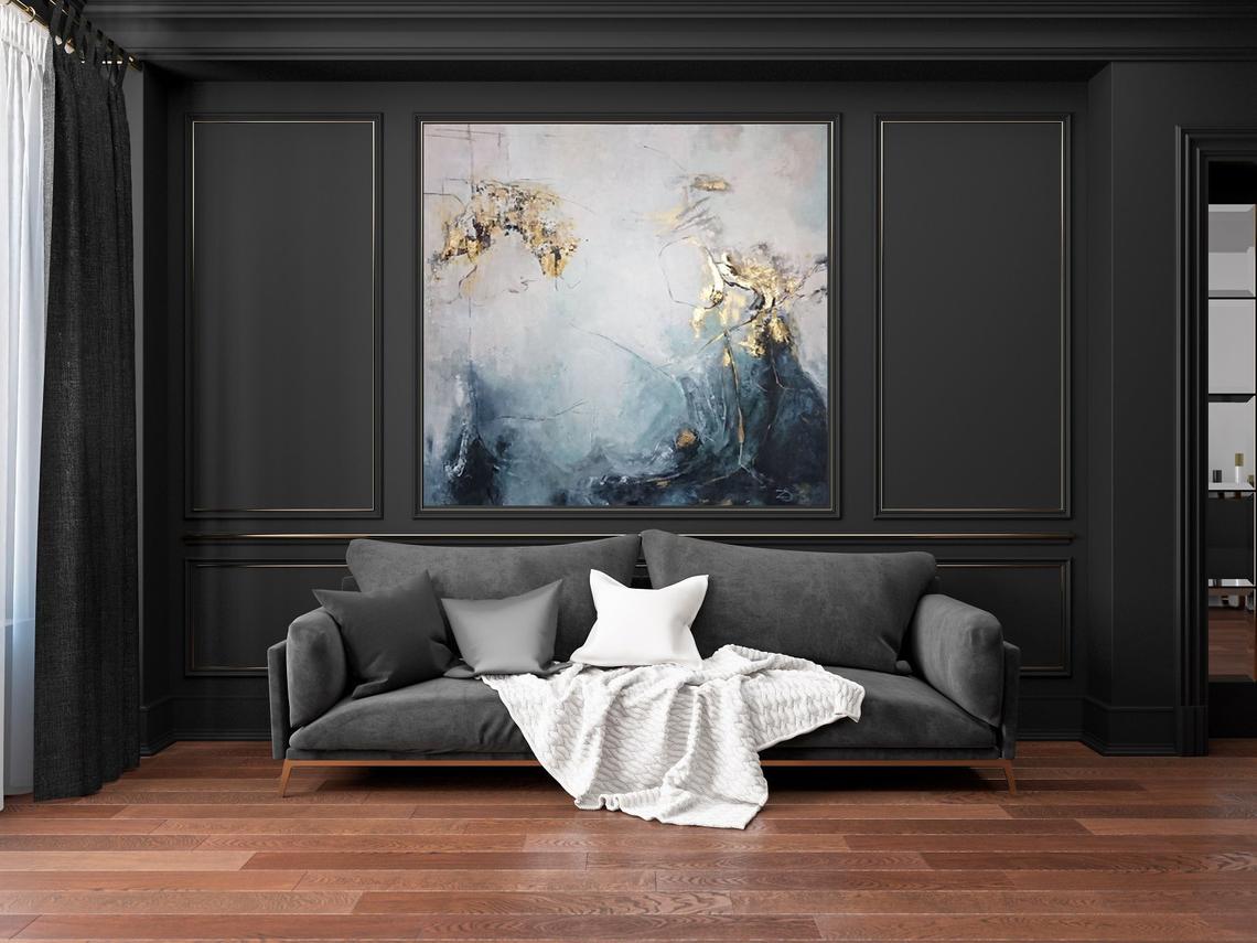 Μόνο «ουάου» μπορεί να αναφωνήσει κάποιος βλέποντας το σκούρο μπλε τοίχο διακοσμημένο με κομμάτια τέχνης. Από μόνος του είναι πολύ διασκεδαστικός, πόσο μάλλον όταν περιτριγυρίζεται από εικόνες διαφορετικών μεγεθών και περιεχομένου. Αν είστε περίεργοι για το πόσο όμορφο φαίνεται το υπόλοιπο